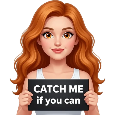 sexy girl with long wavy ginger hair and ginger eyes wearing a white tanktop is holding a black colored sign with CATCH ME if you can written on it emoji