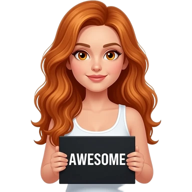 sexy girl with long wavy ginger hair and ginger eyes wearing a white tanktop is holding a black colored sign with AWESOME written on it emoji