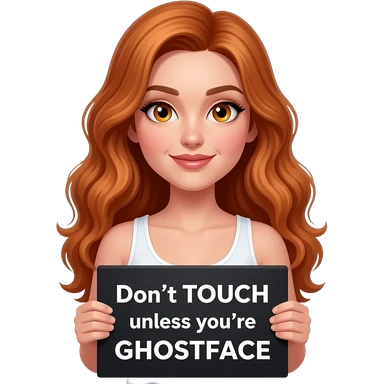 sexy girl with long wavy ginger hair and ginger eyes wearing a white tanktop is holding a black colored sign with Don't TOUCH unless you're GHOSTFACE written on it emoji
