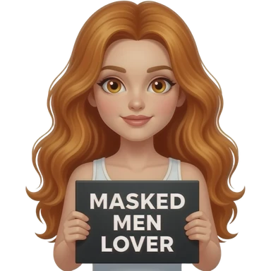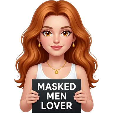 sexy girl with long wavy ginger hair and ginger eyes wearing a white tanktop is holding a black colored sign with MASKED MEN LOVER written on it emoji