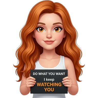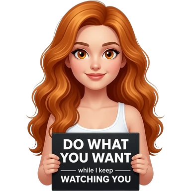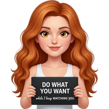 sexy girl with long wavy ginger hair and ginger eyes wearing a white tanktop is holding a black colored sign with DO WHAT YOU WANT while I keep WATCHING YOU written on it emoji