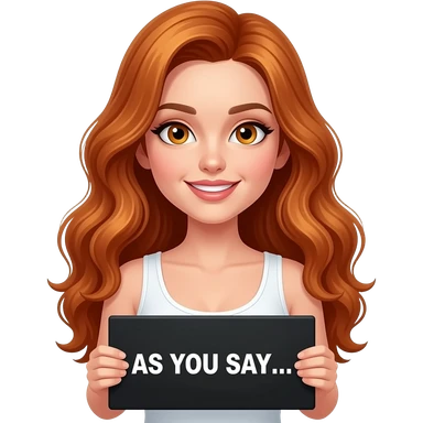 sexy girl with long wavy ginger hair and ginger eyes wearing a white tanktop is holding a black colored sign with AS YOU SAY... written on it emoji