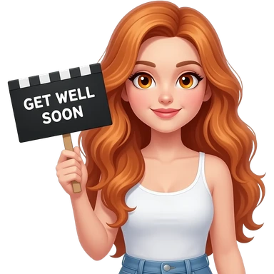 sexy girl with long wavy ginger hair and ginger eyes wearing a white tanktop is holding a black colored sign with GET WELL SOON written on it emoji