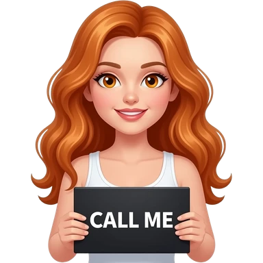 sexy girl with long wavy ginger hair and ginger eyes wearing a white tanktop is holding a black colored sign with CALL ME written on it emoji