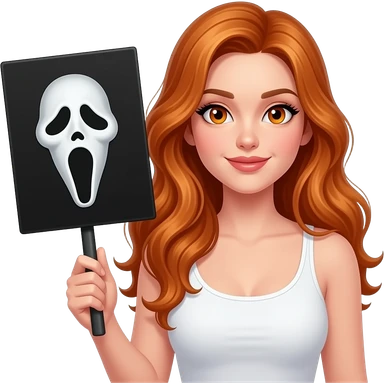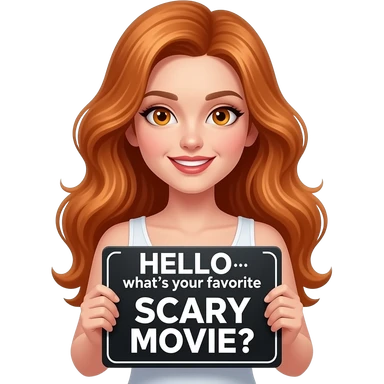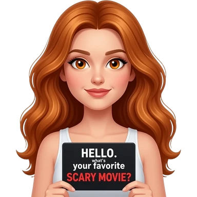 sexy girl with long wavy ginger hair and ginger eyes wearing a top is holding a HELLO... what's your favorite SCARY MOVIE? sign emoji | AI Emoji Generator