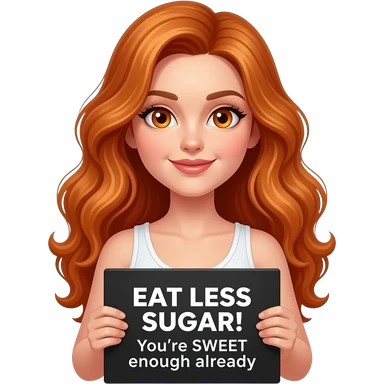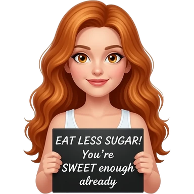 sexy girl with long wavy ginger hair and ginger eyes wearing a white tanktop is holding a black colored sign with EAT LESS SUGAR! You're SWEET enough already written on it emoji