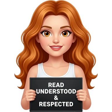 sexy girl with long wavy ginger hair and ginger eyes wearing a white tanktop is holding a black colored sign with READ UNDERSTOOD & RESPECTED written on it emoji