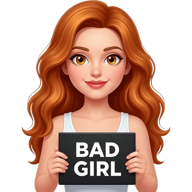 sexy girl with long wavy ginger hair and ginger eyes wearing a white tanktop is holding a black colored sign with BAD GIRL written on it emoji
