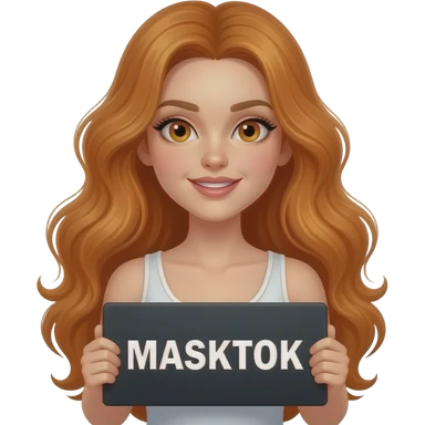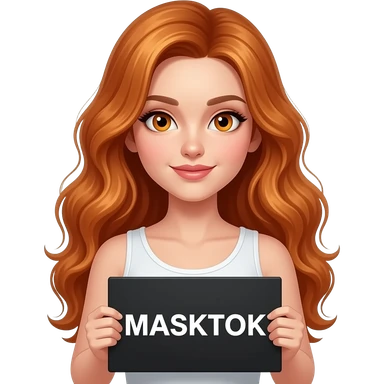 sexy girl with long wavy ginger hair and ginger eyes wearing a white tanktop is holding a black colored sign with MASKTOK written on it emoji