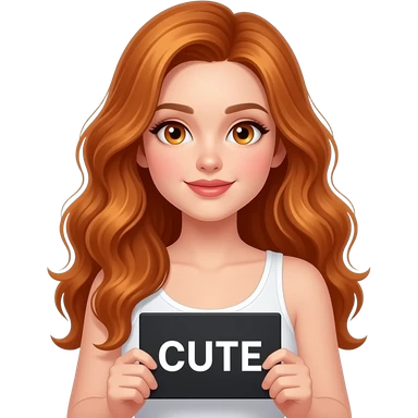 sexy girl with long wavy ginger hair and ginger eyes wearing a white tanktop is holding a black colored sign with CUTE written on it emoji