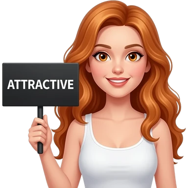 sexy girl with long wavy ginger hair and ginger eyes wearing a white tanktop is holding a black colored sign with ATTRACTIVE written on it emoji