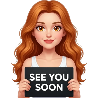sexy girl with long wavy ginger hair and ginger eyes wearing a white tanktop is holding a black colored sign with SEE YOU SOON written on it emoji