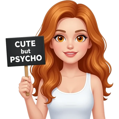 sexy girl with long wavy ginger hair and ginger eyes wearing a white tanktop is holding a black colored sign with CUTE but PSYCHO written on it emoji