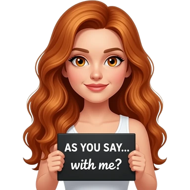sexy girl with long wavy ginger hair and ginger eyes wearing a white tanktop is holding a black colored sign with AS YOU SAY... with me? written on it emoji