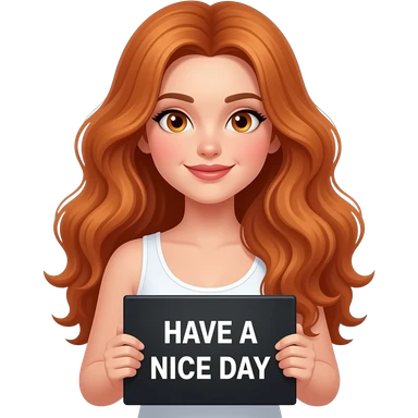 sexy girl with long wavy ginger hair and ginger eyes wearing a white tanktop is holding a black colored sign with HAVE A NICE DAY written on it emoji