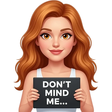 sexy girl with long wavy ginger hair and ginger eyes wearing a white tanktop is holding a black colored sign with DON'T MIND ME... written on it emoji