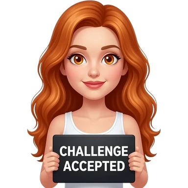 sexy girl with long wavy ginger hair and ginger eyes wearing a white tanktop is holding a black colored sign with CHALLENGE ACCEPTED written on it emoji