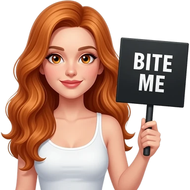 sexy girl with long wavy ginger hair and ginger eyes wearing a white tanktop is holding a black colored sign with BITE ME written on it emoji