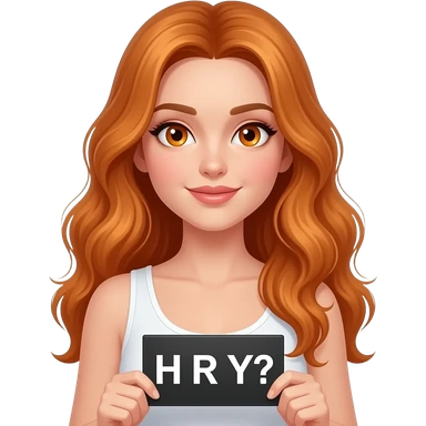 sexy girl with long wavy ginger hair and ginger eyes wearing a white tanktop is holding a black colored sign with H R Y? written on it emoji