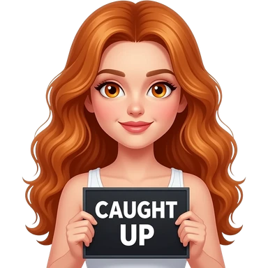 sexy girl with long wavy ginger hair and ginger eyes wearing a white tanktop is holding a black colored sign with CAUGHT UP written on it emoji
