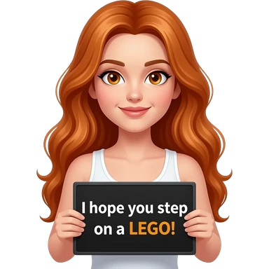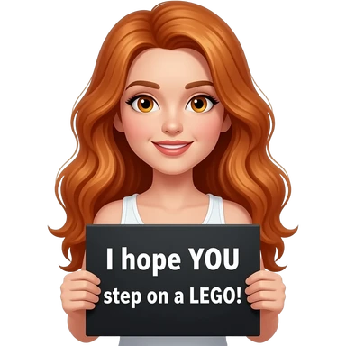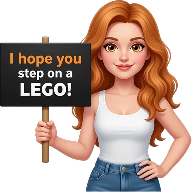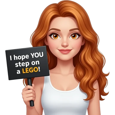 sexy girl with long wavy ginger hair and ginger eyes wearing a white tanktop is holding a black colored sign with I hope YOU step on a LEGO! written on it emoji