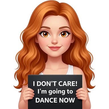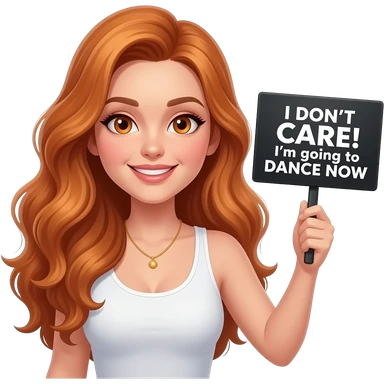 sexy girl with long wavy ginger hair and ginger eyes wearing a white tanktop is holding a black colored sign with I DON'T CARE! I'm going to DANCE NOW written on it emoji
