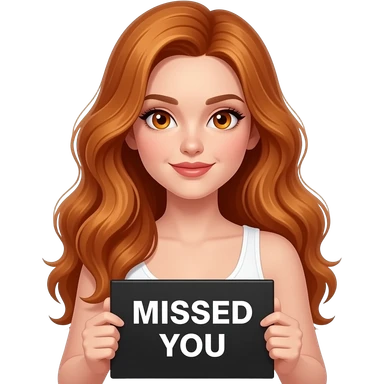 sexy girl with long wavy ginger hair and ginger eyes wearing a white tanktop is holding a black colored sign with MISSED YOU written on it emoji