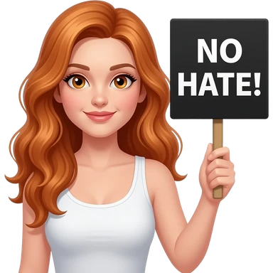 sexy girl with long wavy ginger hair and ginger eyes wearing a white tanktop is holding a black colored sign with NO HATE! written on it emoji