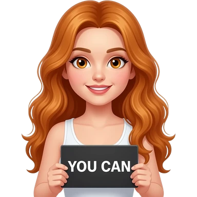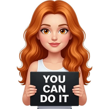 sexy girl with long wavy ginger hair and ginger eyes wearing a white tanktop is holding a black colored sign with YOU CAN DO IT written on it emoji