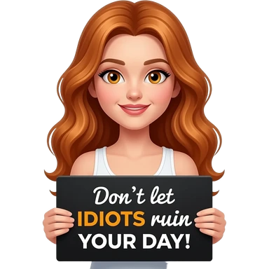 sexy girl with long wavy ginger hair and ginger eyes wearing a white tanktop is holding a black colored sign with Don't let IDIOTS ruin YOUR DAY! written on it emoji
