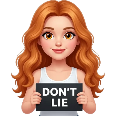 sexy girl with long wavy ginger hair and ginger eyes wearing a white tanktop is holding a black colored sign with DON'T LIE written on it emoji