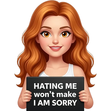 sexy girl with long wavy ginger hair and ginger eyes wearing a white tanktop is holding a black colored sign with HATING ME won't make I AM SORRY written on it emoji