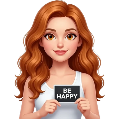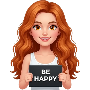 sexy girl with long wavy ginger hair and ginger eyes wearing a white tanktop is holding a black colored sign with BE HAPPY written on it emoji
