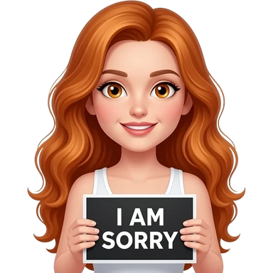 sexy girl with long wavy ginger hair and ginger eyes wearing a white tanktop is holding a black colored sign with I AM SORRY written on it emoji