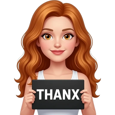 sexy girl with long wavy ginger hair and ginger eyes wearing a white tanktop is holding a black colored sign with THANX written on it emoji