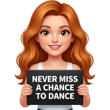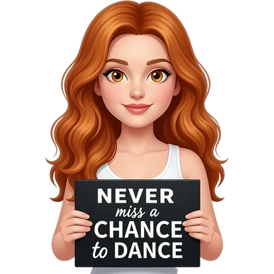 sexy girl with long wavy ginger hair and ginger eyes wearing a white tanktop is holding a black colored sign with NEVER miss a CHANCE to DANCE written on it emoji