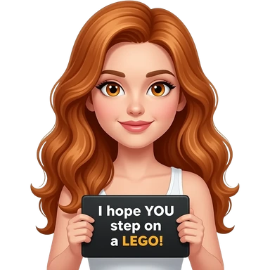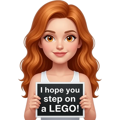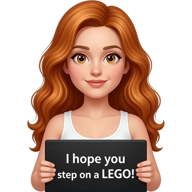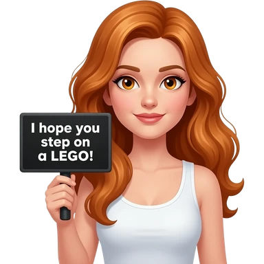 sexy girl with long wavy ginger hair and ginger eyes wearing a white tanktop is holding a black colored sign with I hope you step on a LEGO! written on it emoji