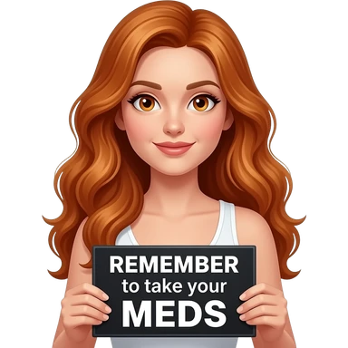 sexy girl with long wavy ginger hair and ginger eyes wearing a white tanktop is holding a black colored sign with REMEMBER to take your MEDS written on it emoji