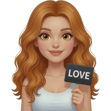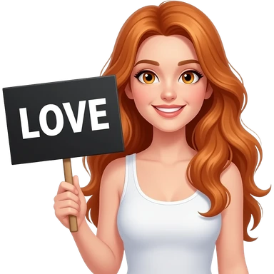 sexy girl with long wavy ginger hair and ginger eyes wearing a white tanktop is holding a black colored sign with LOVE written on it emoji