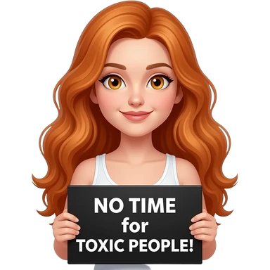 sexy girl with long wavy ginger hair and ginger eyes wearing a white tanktop is holding a black colored sign with NO TIME for TOXIC PEOPLE! written on it emoji