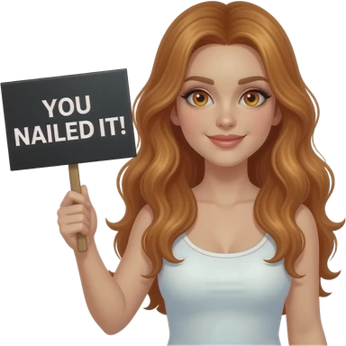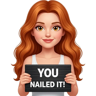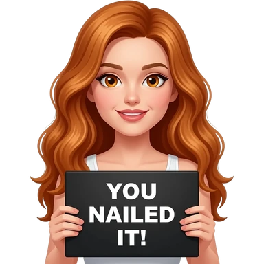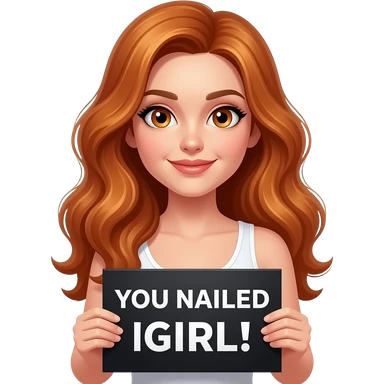 sexy girl with long wavy ginger hair and ginger eyes wearing a white tanktop is holding a black colored sign with YOU NAILED IT GIRL! written on it emoji