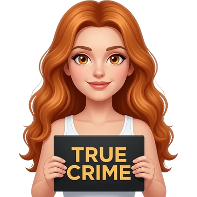 sexy girl with long wavy ginger hair and ginger eyes wearing a white tanktop is holding a black colored sign with TRUE CRIME written on it emoji