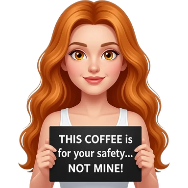 sexy girl with long wavy ginger hair and ginger eyes wearing a white tanktop is holding a black colored sign with THIS COFFEE is for your safety... NOT MINE! written on it emoji