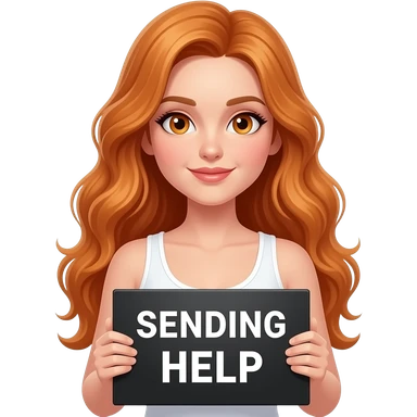 sexy girl with long wavy ginger hair and ginger eyes wearing a white tanktop is holding a black colored sign with SENDING HELP written on it emoji