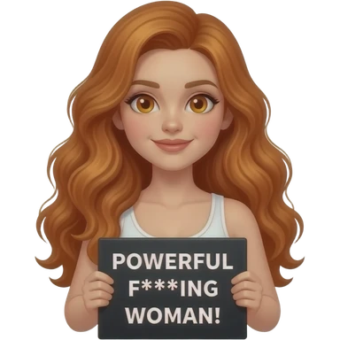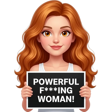 sexy girl with long wavy ginger hair and ginger eyes wearing a white tanktop is holding a black colored sign with POWERFUL F***ING WOMAN! written on it emoji