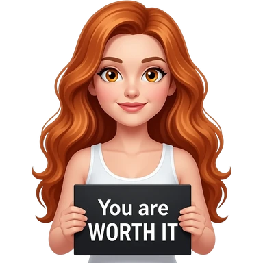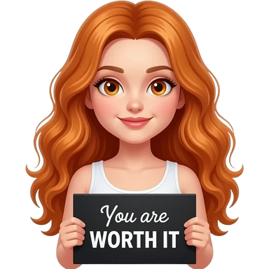 sexy girl with long wavy ginger hair and ginger eyes wearing a white tanktop is holding a black colored sign with You are WORTH IT written on it emoji
