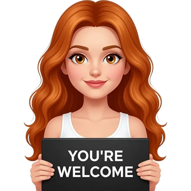 sexy girl with long wavy ginger hair and ginger eyes wearing a white tanktop is holding a black colored sign with YOU'RE WELCOME written on it emoji