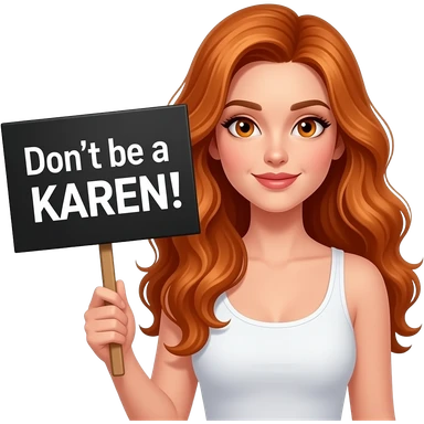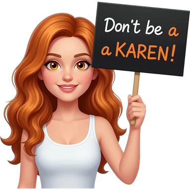 sexy girl with long wavy ginger hair and ginger eyes wearing a white tanktop is holding a black colored sign with Don't be a KAREN! written on it emoji