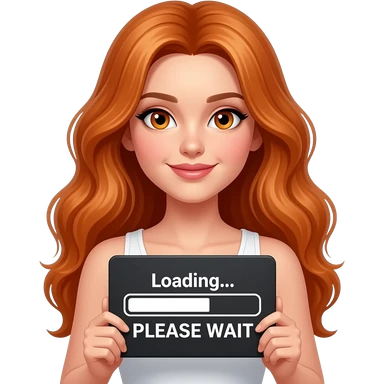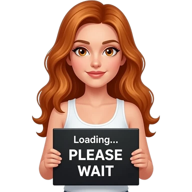 sexy girl with long wavy ginger hair and ginger eyes wearing a white tanktop is holding a black colored sign with Loading... PLEASE WAIT written on it emoji