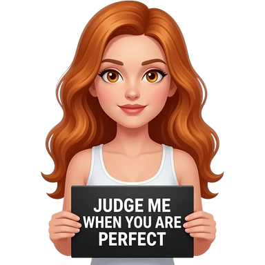 sexy girl with long wavy ginger hair and ginger eyes wearing a white tanktop is holding a black colored sign with JUDGE ME when YOU ARE PERFECT written on it emoji
